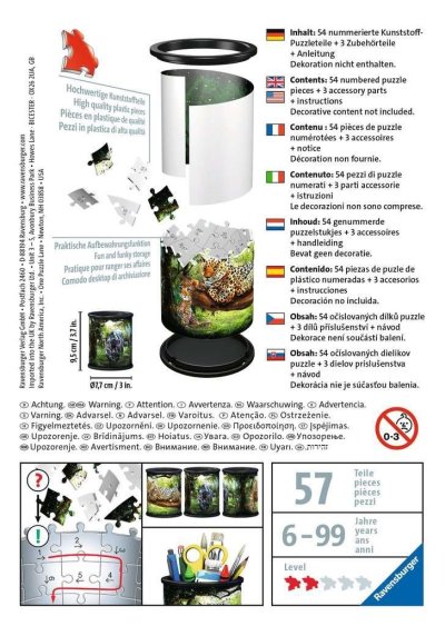 Tužky už se nebudou válet po stole a navíc bude krásný dárek vždycky na očích! Další z řady praktických předmětů ve formě 3D puzzle od výrobce RAVENSBURGER se stane skvělým dárkem pro každou příležitost. A nemusí sloužit pouze jako tužkovník, ale třeba jako stojánek na dekorativní kosmetiku a jiné věci. Speciální zakřivené dílky, které přesně zapadnou na své místo, vytvoří kouzelný stojánek nejen na psací potřeby, ale na cokoliv, co děti potřebují . Dílky jsou vyrobeny z pevného plastu a zaručí vynikající stabilitu bez nutnosti lepení. 3D puzzle RAVENSBURGER lze skládat podle motivu (obtížnější varianta) nebo podle praktického číslování na zadní straně dílků. Stojan má po sestavení výšku přibližně 9,5 cm. Balení obsahuje: