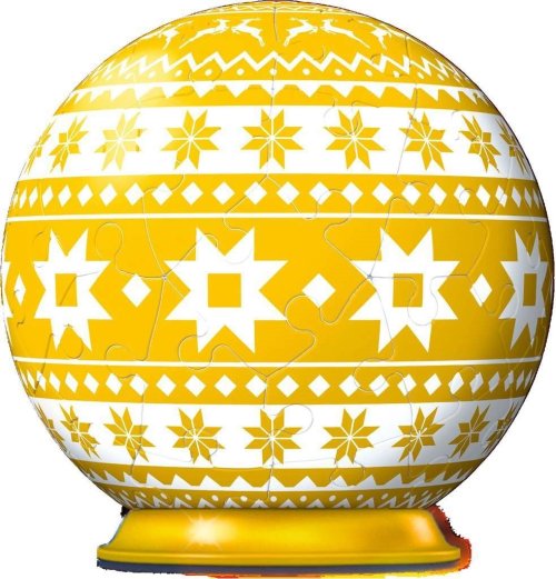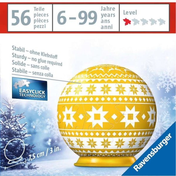 Dekorativní puzzleball jako vánoční baňka. Dokonalá koule bez použití lepidla - to je 3D Puzzle Ball® od RAVENSBURGER . Každý z perfektně propracovaných 56 plastových dílků se podílí na vytvoření pevné, hladké koule. Speciální zahnuté dílky do sebe pěkně zapadají a koule je po sestavení překvapivě stabilní. Baňka drží bez nutnosti lepení. Balení obsahuje 56 dílků, návod a podstavec. Puzzleball® má po sestavení průměr 7,5 cm. Doporučený věk: 6 - 99 let. Rozměr složeného puzzle cca 7,5 x 7,5 x 7,5 cm