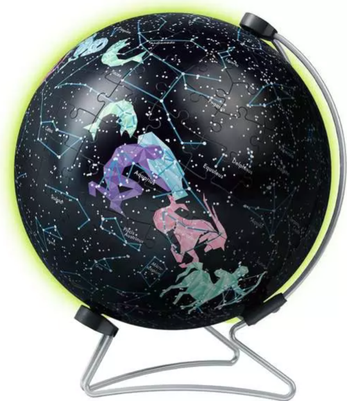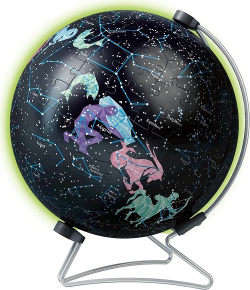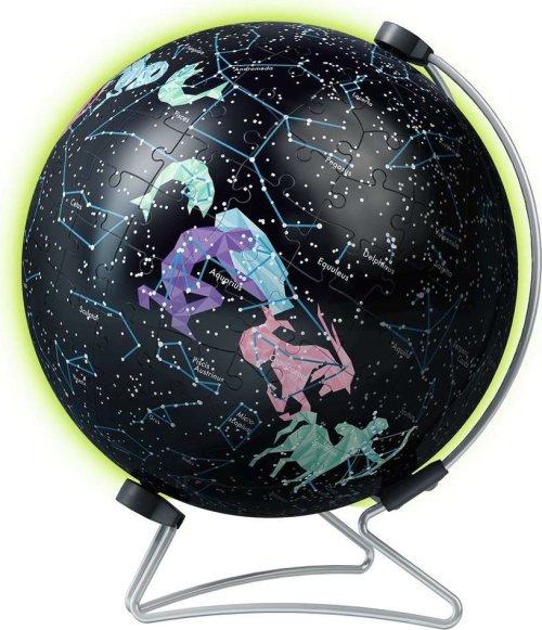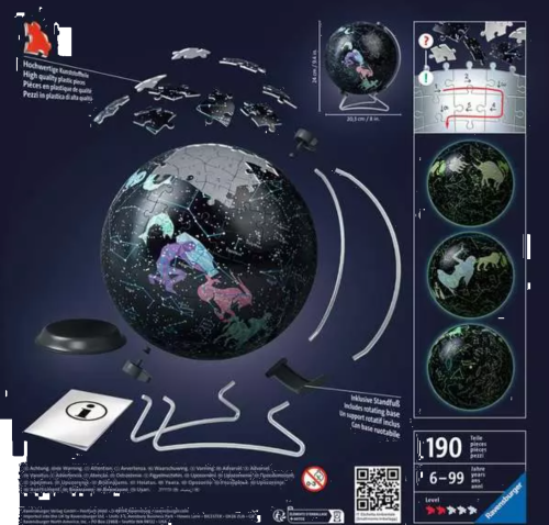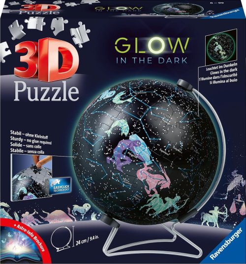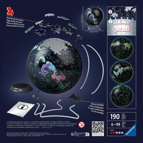 Dokonalá koule bez použití lepidla - to je 3D Puzzle Ball® od RAVENSBURGER . Každý z perfektně propracovaných 180 plastových dílků se podílí na vytvoření pevné, hladké koule. Speciální zahnuté dílky do sebe skvěle zapadají a koule je po sestavení velmi stabilní. Každý dílek je na zadní straně číslovaný, takže můžete skládat pomocí po sobě jdoucích čísel nebo podle obrázku. Puzzleball® má po sestavení průměr 20 cm. Neonové - fluorescenční puzzle má speciální potisk, který po nasvícení ve tmě svítí. Obsah balení: puzzle, podstavec, kovový držák globusu, obrázkový návod. Rozměr složeného puzzle cca 20,3 x 20,3 x 24 cm