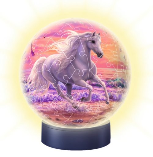 Díky noční edici Nachtlicht od Ravensburgeru můžete mít okouzlující svítící kouli s divokým hřebcem ve svém pokoji. Ke skládání nepotřebujete lepidlo, speciálně vyrobené zakřivené dílky do sebe jednoduše zapadnou a drží tvar.