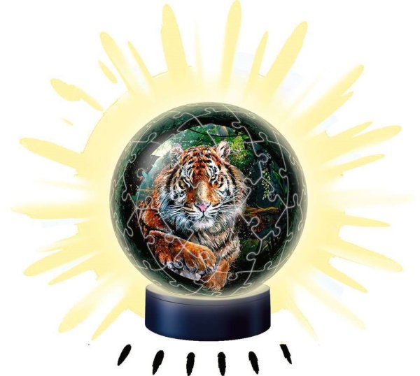 Díky noční edici Nachtlicht od Ravensburgeru může mít okouzlující svítící kouli s motivem krásného tygra i Vaše dítě. Puzzle je velmi oblíbené nejen díky snadné manipulaci, ale i stabilitě. Ke skládání nepotřebujete lepidlo, speciálně vyrobené zakřivené dílky do sebe jednoduše zapadnou a drží tvar. Světlo se aktivuje zvukem - stačí klepnout nebo tlesknout, a koule se rozsvítí. Skládat lze podle obrázku nebo podle čísel - plastové dílky jsou ze zadní strany očíslovány. Průměr puzzleballu je 13 cm. Balení obsahuje: