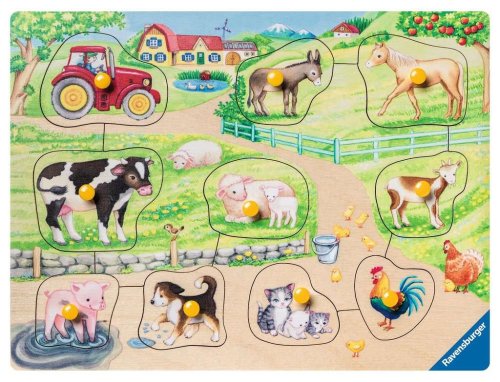 Dřevěná vkládačka s plastovými úchytkami od nejznámějšího výrobce puzzle Ravensburger. Deset vkládacích obrázků, s láskyplně ilustrovanými motivy domácích zvířat ze série Moje první dřevěné puzzle, jsou přizpůsobeny příslušnému věku. Dítě rozvíjí svoji představivost, jemnou motoriku a prostorové vnímání, když se podle tvaru snaží najít správný obrázek a umístit jej do správného otvoru. Tloušťka podkladu cca 0,8 cm. Doporučeno pro děti od 2 let. Rozměr složeného puzzle cca 24 x 22 x 1,2 cm