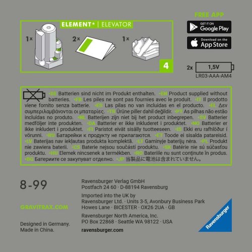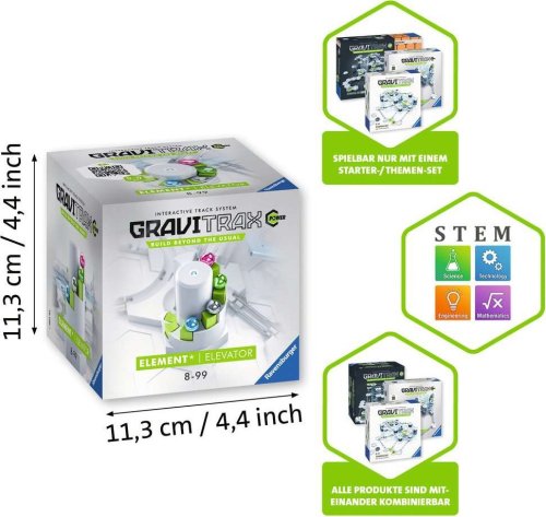 Elektronické Schodiště automaticky vyveze několik kuliček najednou do výšky až 7 výškových kamenů. Nevyžaduje ruční resetování pro novou dráhu. Díky pohonu na baterie je tento doplněk nepřetržitě připraven pro další dráhu. Jakmile kulička vjede na první schod elektronického Schodiště, je automaticky přepravována nahoru. Tím vzniká nová energie pro další kuličky. V kombinaci s novými Startovními sadami GraviTrax Power začíná nekonečný cyklus zábavy s kuličkovou dráhou GraviTrax. Kolik kuliček dokáže Schodiště přepravit současně? Provoz na 2 x 1,5V baterie (LR3-AAA-AM3). Baterie nejsou součástí balení. Rozšiřující prvek GraviTrax Power Schodiště je použitelný se startovací sadou! GraviTrax od německého výrobce Ravensburger je modulární kuličková dráha s možností dalších rozšíření, která nadchne malé i velké stavitele. Stavějte, závoďte s kuličkami a vyzkoušejte sílu gravitace v praxi! Propracovaná stavebnice s variabilními dílky Vám umožní vytvořit si vlastní systém spletitých kuličkových drah nebo postavit některé z předpřipravených řešení. Z jednotlivých stavebních prvků vytvoříte cestičky plné různých akcí, kterými budou kuličky postupně projíždět. Systém kuličkových drah RAVENSBURGER GraviTrax můžete libovolně rozšiřovat o další a další doplňky a vytvářet tak nové podoby složitých a unikátních cestiček s vytuněnými překážkami. Stavebnice zaručuje nikdy nekončící zábavu okořeněnou rozšiřováním vědomostí o vlastnostech gravitace. Plánujte dráhy odkudkoliv! S pomocí aplikace GraviTrax můžete dráhy navrhovat i na svém mobilu nebo tabletu a poté vše vyzkoušet v praxi.