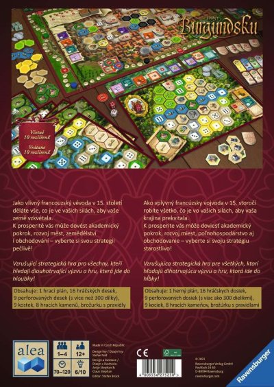 Jako vlivný francouzský vévoda v 15. století děláte vše, co je ve vašich silách, aby vaše země vzkvétala. K prosperitě vás může dovést akademický pokrok, rozvoj měst, zemědělství i obchodování – vyberte si svou strategii pečlivě! Vzrušující strategická hra pro všechny, kteří hledají dlouhotrvající výzvu a hru, která jde do hloubky! Píše se 15. století v Burgundsku ve střední Francii. Jste vlivní vévodové a vašim cílem je, aby vaše panství prosperovala a rozkvétala díky strategické expanzi a obchodu. Hoďte kostkami, objevte své možnosti a najděte strategii, která z vás udělá vítěze. Zemědělství, stavění a výzkum jsou některé z cest, které vás mohou dovést k prosperitě a prestiži. V této budovatelské hře existuje mnoho způsobů, jak získat vítězné body. Zvolte si svou strategii moudře! Ve hře se nachází mnoho různých vévodství, a tak hra nabízí nespočetné množství variací a zůstává výzvou i pro zkušené hráče, protože žádné dvě hry neproběhnou stejně. Vítězem se stává hráč, který má na konci hry nejvíce vítězných bodů. Obsahuje: 1 hrací plán, 16 hráčských desek, 9 perforovaných desek (s více než 300 dílky), 9 kostek, 8 hracích figurek, brožurku s pravidly