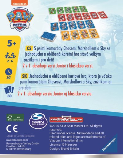 Tato hra přináší rychlou zábavu, jednoduchá pravidla a napětí až do poslední karty. Kombinujte karty strategicky, překazte plány soupeřům a chytrým tahem ukončete hru v ten pravý moment! Ideální volba pro rodinné večery i přátelské souboje, kde se nikdo nebude nudit. Teď přichází 11! i ve speciální verzi pro fanoušky Tlapkové patroly! S oblíbenými hrdiny Chasem, Marshallem a Sky je hra ještě zábavnější a přístupná i těm nejmenším hráčům. Tato edice nabízí 2-v-1: Junior verzi pro děti a klasickou verzi pro zkušenější hráče. 11! – zábava pro všechny věkové kategorie, kterou si užije celá rodina!