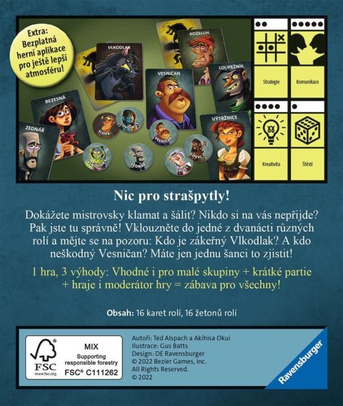 Jedna noc. Jeden den. Jedno rozhodnutí. Nic pro strašpytly! Dokážete mistrovsky klamat a šálit? Nikdo si na vás nepřijde? Pak jste tu správně! Vklouzněte do jedné z dvanácti různých rolí a mějte se na pozoru: Kdo je zákeřný vlkodlak? A kdo neškodný vesničan? Máte jen jednu šanci to zjistit! Tato napínavá společenská hra vás s partou přátel zabaví klidně na celý večer. Vžijte se do jedné z nabízených rolí a rozjeďte napínavý příběh. Nechce se nikdo z vás ujmout role moderátora? Nevadí. Součástí hry je aplikace, kterou si snadno a zdarma stáhnete do svého chytrého telefonu, a pomocí nahrávek za vás převezme roli moderátora a provede vás celou hrou.