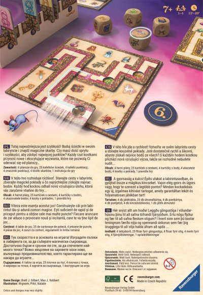 4 herní plány, 24 oboustranných kartiček s cestami, 1 menší žolíková kartička, 4 oboustranné kartičky s body, 4 ukazatele bodů, 4 kostky s poklady.