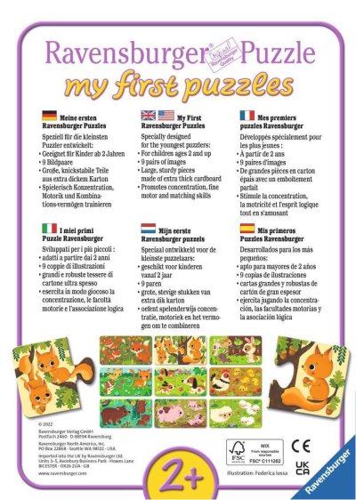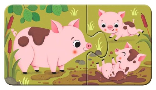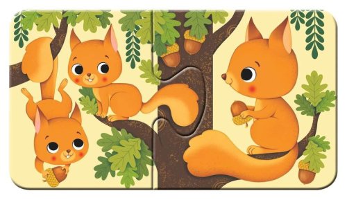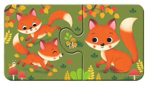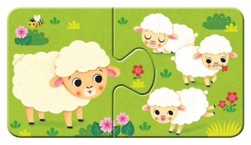 Robustní pevné dílky jsou vyrobeny z extra silného kartonu. Skládání podporuje u dětí rozvoj motoriky, soustředění a fantazii. Devět různých obrázků ze dvou dílků. Učí se poznávat zvířátka a jejich mláďátka.
