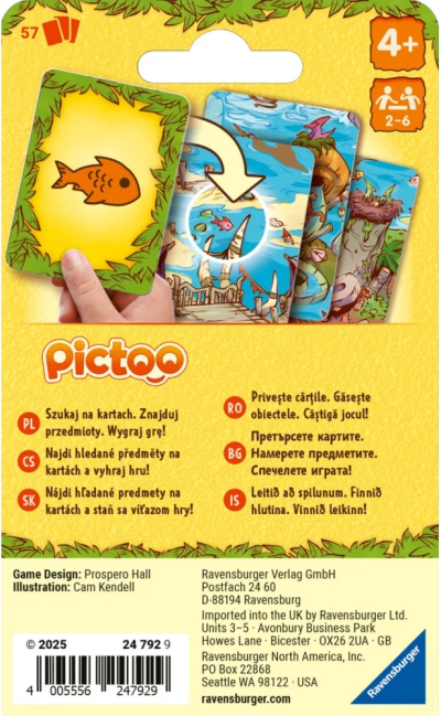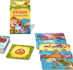 Pictoo je rychlá hra, ve které hráči hledají objekty na kartách a snaží se co nejdříve zbavit všech svých karet. Vyhrává ten nejrychlejší! Ideální pro rodiny a přátele, kteří si užijí hledání v prostředí oblíbených dinosaurů.