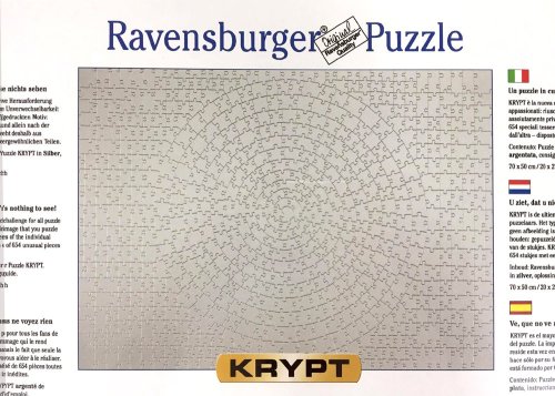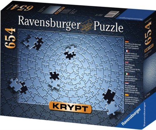 Skutečná výzva - puzzle skládané pouze podle tvarů dílků! Vidíte, že nic nevidíte :-) - žádný obrázek, jen jednobarevná plocha. KRYPT je největší výzvou pro všechny fanoušky puzzle. Není to tištěný obrázek, ale tvary jednotlivých kousků, podle kterých musíte skládat. KRYPT se skládá ze 654 kousků neobvyklých tvarů - žádné dva dílky nejsou stejné. Barva: stříbrná Rozměr složeného puzzle cca 70 x 50 cm