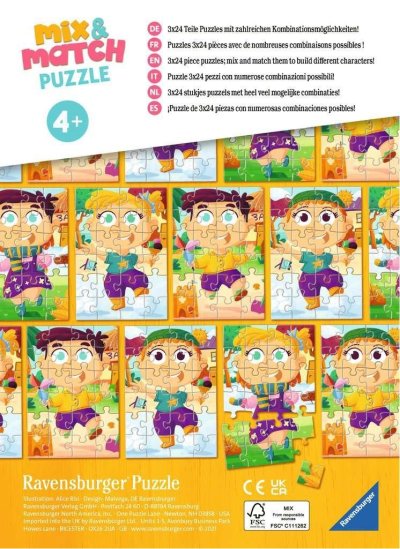 Míchej a skládej! Můžeš poskládat motivy podle obrázků a nebo vzájemně kombinovat a míchat jednotlivé dílky ze všech tří puzzle a vytvářet nové legrační postavy. To bude zábava! V jedné krabičce najdete tři puzzle pro děti s 24 dílky.
