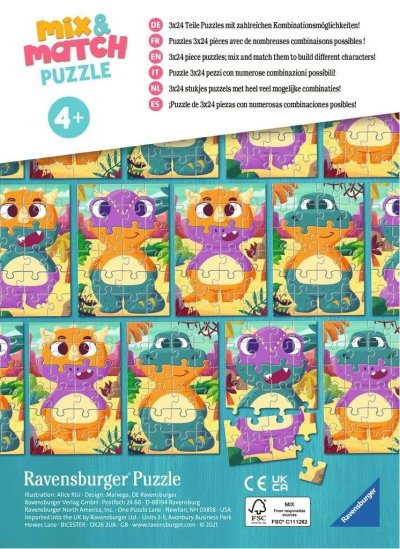 Míchej a skládej! Můžeš poskládat motivy podle obrázků a nebo vzájemně kombinovat a míchat jednotlivé dílky ze všech tří puzzle a vytvářet nové legrační postavy. To bude zábava! V jedné krabičce najdete tři puzzle pro děti s 24 dílky.