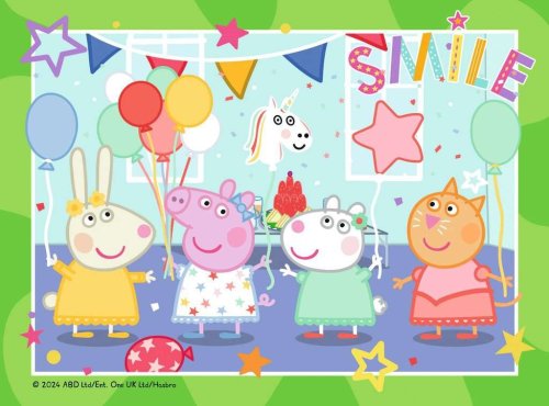 Progresivní puzzle s různou obtížností - 4 puzzle s 12 - 24 dílky, s vyšším počtem dílků se zmenšuje jejich velikost. Rozměr složeného puzzle cca 19 x 14 cm