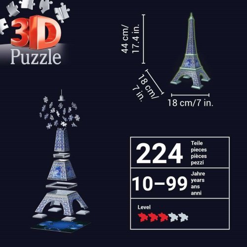 Eiffelova věž ve speciální Svítící edici! Svítící stavba od mistra ve výrobě puzzle RAVENSBURGER. Každý z perfektně propracovaných 224 plastových dílků umožňuje postavit fascinující model slavné Eiffelovky. Neonové - fluorescenční puzzle má speciální potisk, který po nasvícení ve tmě svítí. Obsah balení: puzzle, návod. Rozměr složeného puzzle cca 44 x 18 x 18 cm