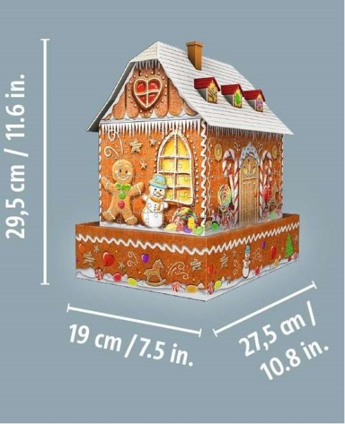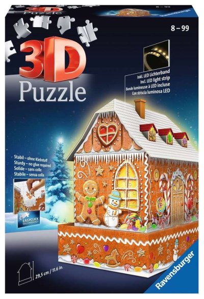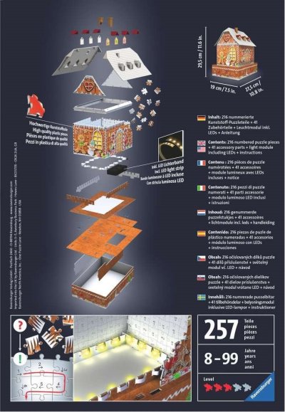 Vytvořte si vlastní zimní říši divů s touto barevnou perníkovou chaloupkou v noční edici! Pokud milujete předvánoční období, v této sladké perníkové chaloupce si jistě přijdete na své. Díky jedinečné technologii EASYCLICK lze 216 dílů snadno přeměnit na krásný a stabilní dům, kdy do sebe dílky bez lepidla perfektně zapadají. Ilustrované pokyny pomohou začátečníkum i pokročilým uživatelům ve skládání této nádherné 3D stavby. Balení obsahuje: 216 očíslovaných dílků puzzle, 41 dílů příslušenství, světelný modul včetně LED a návod. Baterie 3x AAA nejsou součástí výrobku.