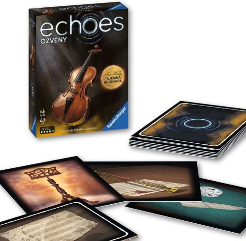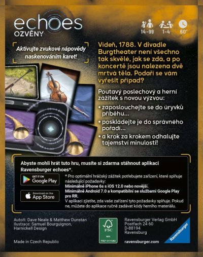 Vídeň, 1788. V divadle Burgtheater není všechno tak skvělé, jak se zdá, a po koncertě jsou nalezena dvě mrtvá těla. Podaří se vám vyřešit tento tajemný případ? Echoes, to jsou napínavé detektivní audiohry pro celou rodinu i partu přátel. Jak dobře dokážete naslouchat zvukům ve svém okolí? Ve hře echoes vyšetřujete záhady za použití svých speciálních schopností. Až budete zkoumat jednotlivé předměty, uslyšíte ozvěny z minulosti – tajemné zvuky a hlasy, které vám umožní odhalit tajnou historii předmětů a seřadit události do správného pořadí. Aktivujte zvukové nápovědy naskenováním karet. Poslouchejte zvuky a dialogy, které jsou propojené s herním materiálem. Najděte při poslechu všechny indicie, poskládejte je do správného pořadí a vyřešte záhadu. Ke hře je nutné stáhnout zdarma aplikaci Ravensburger echoes, která je kompletně namluvená v češtině – vypravěč Václav Neužil.