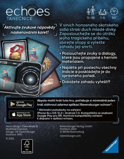 V síních honosného skotského sídla straší duch mladé dívky. Zaposlouchejte se do útržků jejího tragického příběhu, sbírejte stopy a vyřešte záhadu její smrti. Echoes, to jsou napínavé detektivní hry pro celou rodinu i partu přátel. Jak dobře dokážete naslouchat zvukům ve svém okolí? Ve hře echoes vyšetřujete záhady za použití svých speciálních schopností. Až budete zkoumat jednotlivé předměty, uslyšíte ozvěny z minulosti – tajemné zvuky a hlasy, které vám umožní odhalit tajnou historii předmětů a seřadit události do správného pořadí. Aktivujte zvukové nápovědy naskenováním karet. Poslouchejte zvuky a dialogy, které jsou propojené s herním materiálem. Najděte při poslechu všechny indicie, poskládejte je do správného pořadí a vyřešte záhadu. Ke hře je nutné stáhnout zdarma aplikaci Ravensburger echoes, která je kompletně namluvená v češtině – vypravěč Václav Neužil.