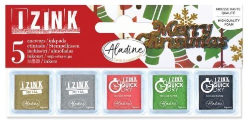 Razítkovací inkoustové polštářky k diářovým razítkům Aladine. Sada obsahuje 5 ks barevných rychleschnoucích inkoustových polštářků ve vánočních barvách. Metalické odstíny (zlatá, stříbrná) schnou 30 minut.