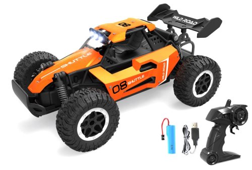 RC auto v měřítku 1:16 představuje vysoce výkonný model závodního auta, který je ideální pro všechny nadšence do dálkově ovládaných vozidel. Tento off-road model je vybaven robustní konstrukcí s výraznými šestihrannými pneumatikami, které zajišťují vynikající přilnavost a stabilitu i na náročném terénu. Karoserie vozu je vyrobena z odolných plastových materiálů a je dostupná v několika barevných variantách, mezi které patří černá, oranžová a modrá, přičemž všechny mají sportovní design s aerodynamickými prvky, jako je zadní spoiler s nápisem "WILD ROAD".