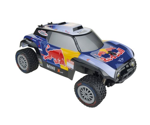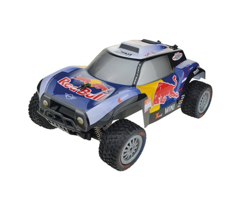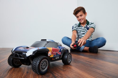 Dvoukanálový model auta na dálkové ovládání X-Raid MINI JCW Buggy Red Bull 1:16, frekvence 2,4 GHz. Může jezdit až 10 závodníků najednou. 30,5 x 11,5 x 17 cm. Na baterie auto 4 x LR6 AA (1,5V), ovladač 1x 6LF22 (9V).