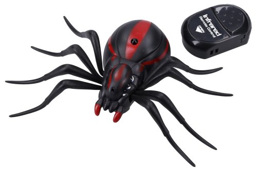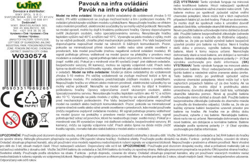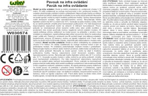 RC pavouk černá vdova. Velikost 15 cm. Pohyb dopředu a couvání do strany. 6xLR44 baterie součástí (3 ovladač, 3 pavouk). Krytka na baterie a ON/OFF přepínač na spodní straně. A,B,C frekvenční kanály. Obrázkový návod na obalu.