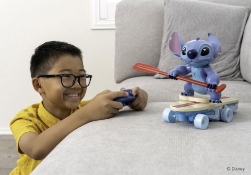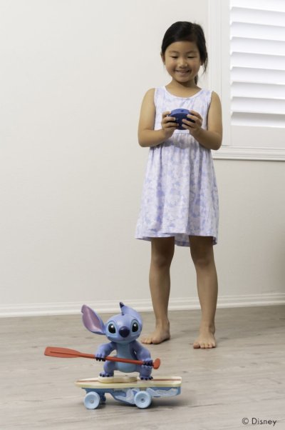 RC Stitch Surfař na dálkové ovládání. 1 kanál (jezdí dopředu, vzad zatáčí), frekvence 2.4 GHz. Když Stitch spadne umí se sám zvednout zpátky. Délka 25 cm.