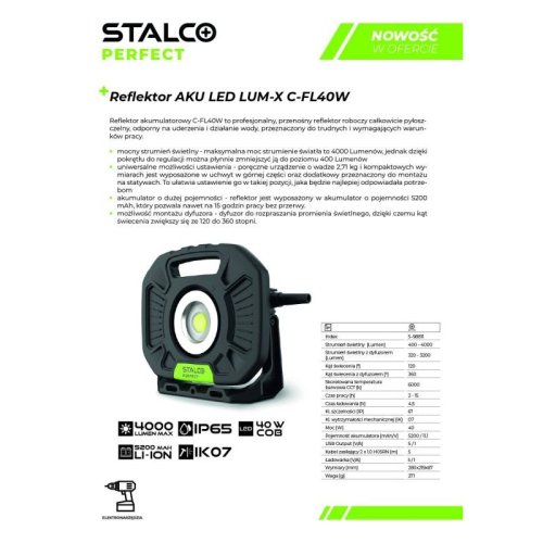 Vlastnosti: technologie COB LED 40 W poskytuje světelný tok až 4 000 lumenů s funkcí plynulé regulace intenzity světla praktické tlačítko zapnutí/vypnutí indikátor nabití akumulátoru přídavná rukojeť …