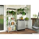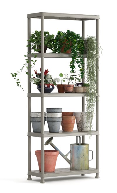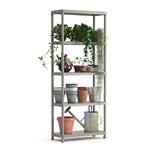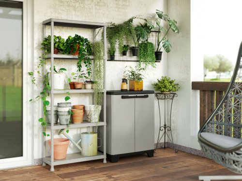 Skříň obsahuje celkem 5 polic - každá s výraznou nosností až 25 kg, které přijdou vhod pro výrazně těžší předměty všeho druhu. Lze ji tedy využít pro skladování dílenského nářadí či zahradnických potřeb, kdy přijde vhod pro uložení náčiní, které by se jinam nevešlo. Zároveň regál vypadá dekorativně. Rozmístěte na poličky květiny nebo keramické či jiné ozdoby a vylepšete si design své dílny, zimní zahrady, balkonu nebo domácnosti. Regál rovněž můžete přimontovat na zeď. Díky svému provedení v univerzální šedé barvě zapadne do každého prostoru bez ohledu na jeho konceptuální styl. Regál je vyrobený z 80 % z recyklovaných materiálů.