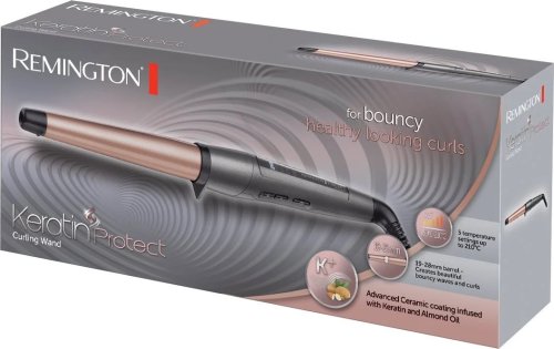 Kónická kulma Remington Keratin Protect Curling Wand Vám umožní snadno dosáhnout krásných vlnitých vlasů a elegantních kudrlin. Její speciální keramický povrch je napuštěn keratinem a mandlovým olejem a pomáhá tak Vaše vlasy chránit před poškozením v průběhu tepelného stylingu, zanechává je jemné, lesklé a zdravé. Kónický tvar kulmy umožňuje snadné vytváření různých typů vln, přesně dle Vašich požadavků a je ideální pro vytvoření přirozeného stylingu vlasů od kořínků ke konečkům. Průměr kulmy se zužuje v rozmezí od 28 mm do 19 mm. Hrubý povrch Grip Tech usnadňuje úpravu vlasů, protože vlasy k povrchu lépe přilnou a nedochází k jejich sjíždění. Kulma umožňuje 5 různých stupňů nastavení teploty a přizpůsobí se tak každému typu vlasů. Manipulaci s kulmou usnadňuje 3 metry dlouhý otočný kabel v kombinaci s chladnou špičkou. Součástí balení je také tepluvzdorná rukavice a luxusní žáruvzdorné pouzdro.