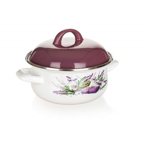 Smaltovaný kastrol LAVENDER 1 l. Vysoká poklice ve fialové barvě, kastrol s bílou glazurou a dekorem na vnější straně. Kastrol lze používat na všechny typy varných desek mimo indukce.