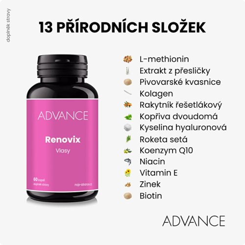 Renovix je unikátní doplněk stravy. Obsažené přírodní aktivní látky napomáhají komplexně pečovat o Vaše vlasy, podporují jejich růst a přispívají tak k udržení krásných a zdravých vlasů.