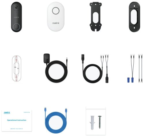 Obsah balení: zvonek s kamerou, interiérový zvonek, montážní deska, montážní klín, šablona montážních otvorů, napájecí adaptér (1,5 m), prodlužovací kabel (4,5 m a 0,1 m), propojovací kabely, síťový kabel (1 m) a vruty.