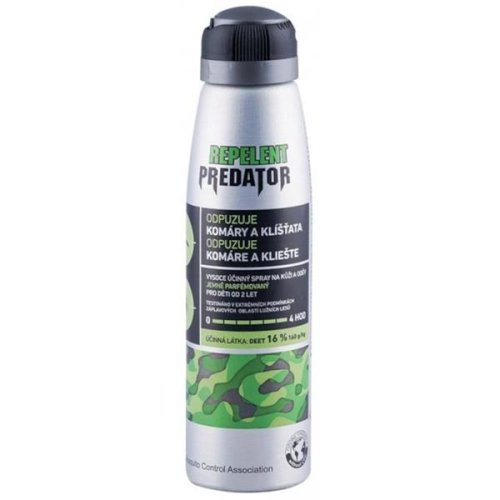 Univerzální aerosolový repelent Predator 16 % proti komárům, klíšťatům a muchničkám vhodný k aplikaci na pokožku i oděv. Lze použít ve všech zeměpisných pásmech proti všem druhům komárů a klíšťat včetně tropických. Výhoda aerosolové aplikace spočívá v dokonalejším rozptýlení na všechny části těla, obuvi a oděvů. Toho docílíte u výrobků Predator díky 360° ventilu, dokonalému roztoku a jemnému rozprašování. Tohoto efektu nedocílíte u sprejů s mechanickým rozprašovačem, kde při rozprašování ošetříte jen ohraničené kruhy, mezi nimiž zůstane neošetřené místo, na které se hmyz dostane a bodne. Pro děti od 2 let. Doba účinnosti 2–4 hodiny. Hlavní přednosti: