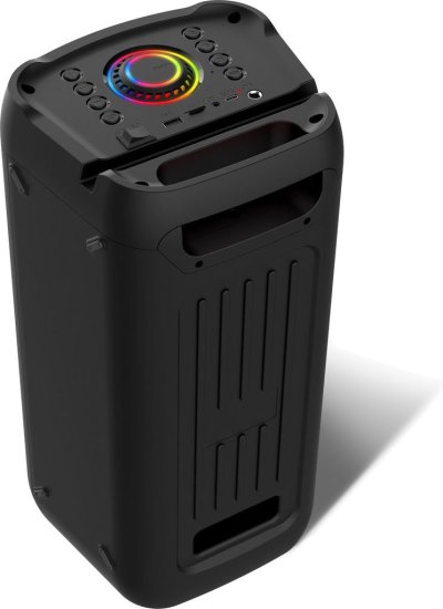 Reproduktor má opravdu široké možnosti ovládání a připojení. Na horním panelu najdete například tlačítka pro přehrávání, přepínání režimů a ovládání hlasitosti. Díky konektorům USB-A, USB-C, microSD slotu, AUX vstupu a 6,3mm jacku pro mikrofon připojíte vše, co potřebujete. Reproduktor podporuje Bluetooth profily L2CAP, AVRCP, HSP, HFP a díky dosahu až 10 metrů si hudbu užijete bez zbytečných kabelů.