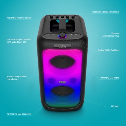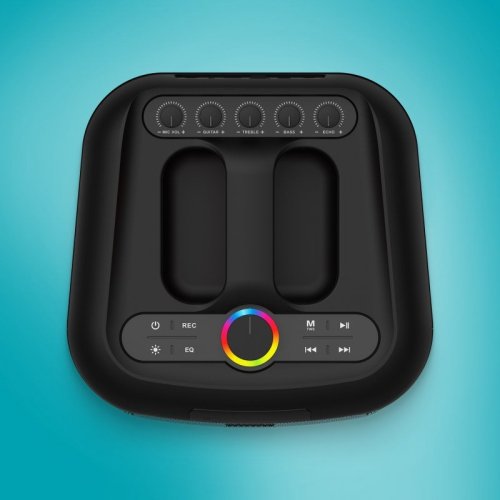 Vyberte si jeden z 8 nastavitelných LED efektů a vytvořte dokonalou atmosféru na každé párty. K reproduktoru navíc dostanete i bezdrátový mikrofon. Připojte ho k němu, zapněte karaoke režim a užijte si zábavu s přáteli. Svůj pěvecký výkon můžete dokonce nahrát.