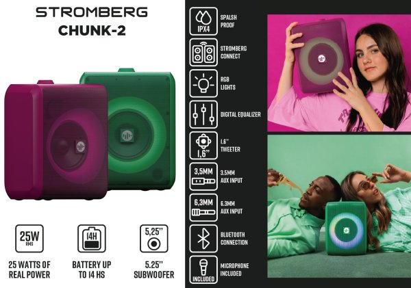 Stromberg CHUNK vás překvapí nejen svým stylovým vzhledem ve výrazné barvě, ale také funkcemi, které oceníte doma i venku. V balení najdete kabelový mikrofon, díky kterému můžete snadno spustit karaoke nebo vést prezentaci. Funkce TWS umožňuje propojení dvou jednotek pro stereo efekt a IPX4 krytí zajistí ochranu před stříkající vodou. Díky hmotnosti 2,3 kg a kompaktním rozměrům si reproduktor vezmete kamkoliv s sebou.