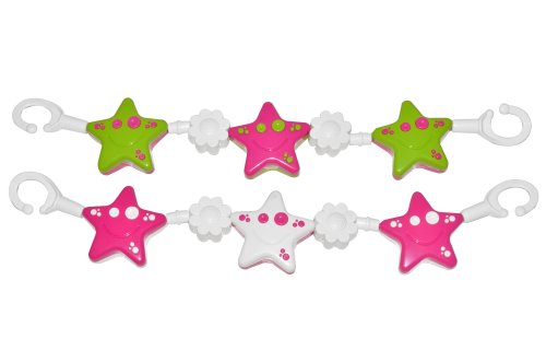 Řetěz na kočárek - hvězdy, kytičky. Figurky z tvrdého plastu navlečené na mírně pružicím lanku jsou barevné a jednoduše tvarované (stačí umýt v mýdlové vodě). Snadno se připevní na kočárek. Jsou vyrobeny ze zdravotně nezávadných materiálů podléhajícím přísným hygienickým normám.