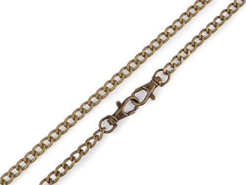 Řetízek je zajímavý svým povrchem, který zdobí reliéf. Očka jsou oválná. Využijete ho hlavně na ucha kabelek nebo na ozdobení bot, klobouků apod. Řetízek není určený na velkou zátěž. Součástí řetízků jsou karabinky.