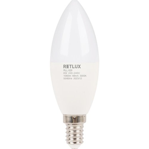 Svíčka 8 W Populární náhrada za vláknovou žárovku 76W Energetická třída D Patice E14 220-240V 3000K - teplá bílá Životnost více než 25000h Světelný tok: 1080 lm Rozměry: 127x42 mm (d*Ø)