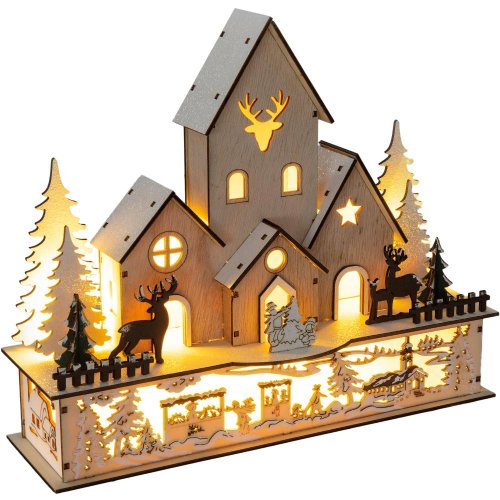 Vánoční vesnička s LED Materiál dřevo Barva LED teplá bílá Velikost 30 x 10 x 25 cm Počet LED 9 Napájení baterie 2 x AA (nejsou součástí balení) Krytí IP20