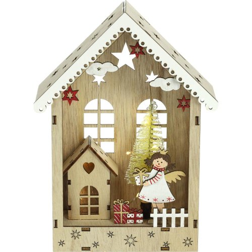 Domek s andělem Dřevo Časovač Rozměr: 16 x 22,5 x 6,5 cm Počet LED: 6 Barva světla: teplá bílá Napájení: 2x AAA Pouze pro vnitřní použití Krytí: IP 20 Hmotnost: 211g