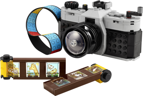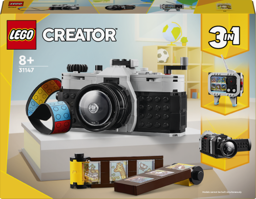 Inspirujte děti od 8 let k nápaditému hraní se stavebnicí LEGO® Creator 3 v 1 (31147) Retro fotoaparát. Model fotoaparátu má pohyblivý objektiv, na horní straně najdete tlačítka k pořízení fotografie a vzadu je otvor, do kterého můžete umístit film z kostek a barevný textilní pásek na nošení. Součástí je také 6 samolepek, které představují fotografie a děti je nalepí na jednotlivá filmová políčka.