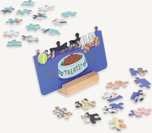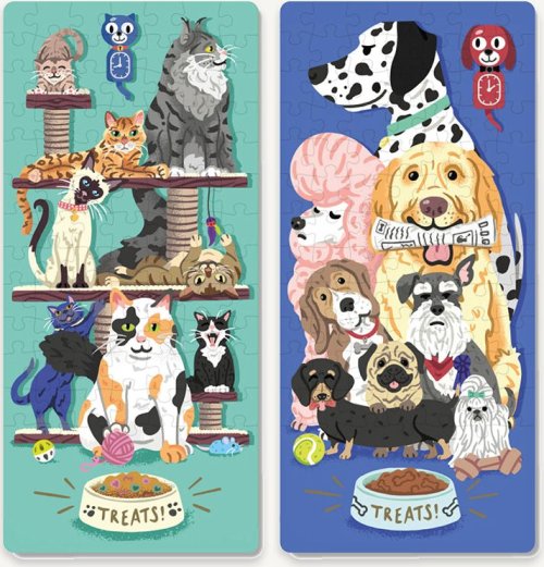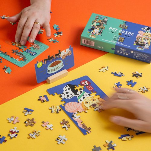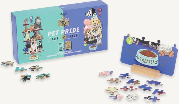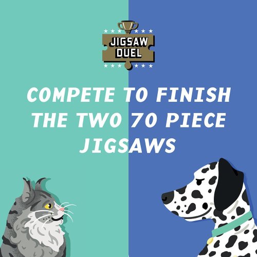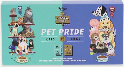 Soutěžní puzzle pro dva - to je puzzle Duel od Ridley's Games. Skládačku však může úspěšně dokončit pouze ten rychlejší z vás. Soutěží se totiž o poslední dílek, který je oboustranný a společný pro obě puzzle. Nejdříve si vyberte své oblíbené domácí mazlíčky (kočky nebo psy), odstartujte závod a pusťte se do skládání. Vítězem se stává ten, kdo jako první poskládá své puzzle a vloží do něj poslední dílek. Ideální pro všechny, kteří si chtějí zaskládat i zasoutěžit.. Součástí balení jsou dvě barevné předlohy skládaného motivu a dřevěný stojánek, který drží poslední vytoužený dílek. Balení je zcela bez plastových obalů. Rozměr složeného puzzle cca 12 x 26 cm