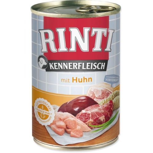 Konzerva s kuřecím masem. Kompletní krmivo pro dospělé psy. Lahodné kousky masa.