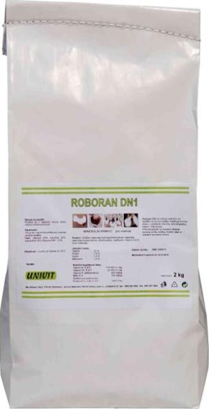 ROBORAN DN1 je vitamíno-minerální přípravek do krmiva určený pro nosnice od začátku do konce snášky. Doplňuje krmnou dávku o potřebné vitamíny, aminokyseliny, makro a mikrominerální látky (Fe, Cu, Zn, Mn, I, Se, Ca, Na, P) v optimálních dávkách. Vápník potřebný pro tvorbu vajec je ze 60 - 70% hrazen přímo z krmiva a ze 30 - 40% je čerpán z kostí. Fosfor je v krmivech rostlinného původu vázán v solích kyseliny fytové, z níž je drůbeží špatně využíván. Dodáním fytázy výrazně stoupá stravitelnost fytinového fosforu a rovněž se zlepšuje i využití vápníku a aminokyselin.