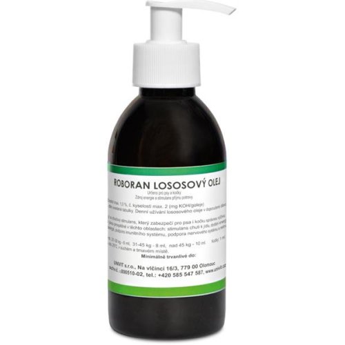 Roboran lososový olej je přírodní produkt s přirozeně vysokým obsahem důležitých nenasycených mastných kyselin, které jsou pro zdraví zvířete nezbytné, avšak organizmus je nedokáže sám vyrobit. Omega 3 nenasycené mastné kyseliny jsou polynenasycené mastné kyseliny obsažené v tuku, ale pouze nenasycené mastné kyseliny pocházející z ryb jsou zdraví prospěšné. Lososový olej je výborným přírodním zdrojem mastných kyselin s jejich vysokou koncentrací: Omega 3 nenasycené mastné kyseliny pocházející z ryb jsou podstatné pro život a dobré zdraví, chrání před chorobami.