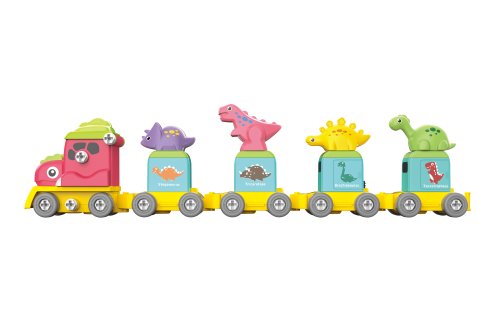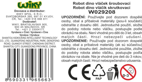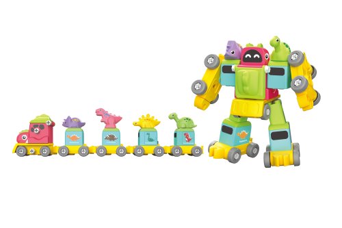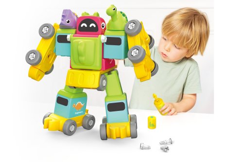 Robot dino vláček šroubovací. Balení obsahuje rozloženou mašinku se 4 vagony, návod na složení vláčku i robota a šroubovák. Lze složit vláček se 4 vagonky, nebo jednoho robota.