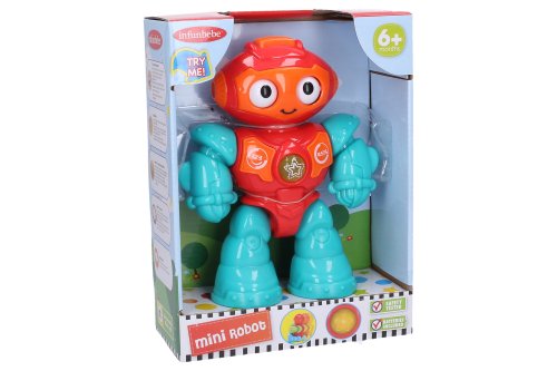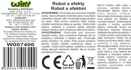 Volná kolečka na zadní straně nohou, lze ho posadit a jezdit. Automatické vypnutí při nečinnosti. 2 x AA, součástí.