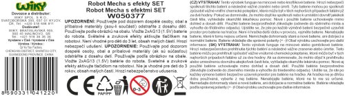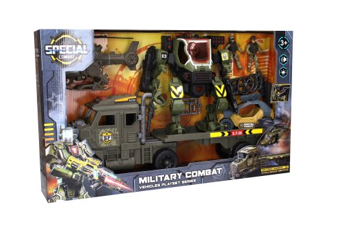 Robot mecha s efekty set s tahačem a helikoptérou. Obsah balení - vojenský tahač 60x11x21 cm (volná kola), robot s efekty 25x11x26 cm, helikoptéra 24x13 cm, bugina s kulometem 16 cm, 2x figurka pilot 11 cm, opevnění a vybavení pro vojáky. Robot vydává světelné a zvukové efekty. Aktivace tlačítkem ve středu robota. Opakovaným stiskem se přepínají různé zvukové efekty (pohyb robota, střelba, apod.). Robot - 2xAG13 baterie součástí balení.