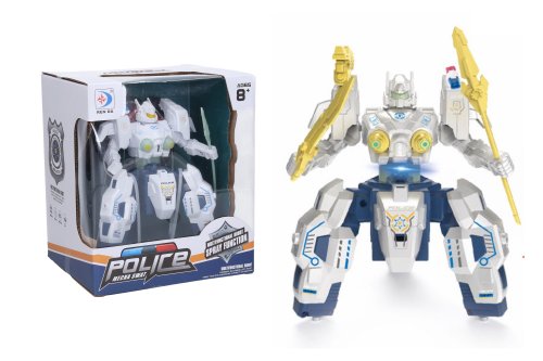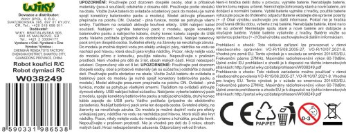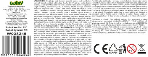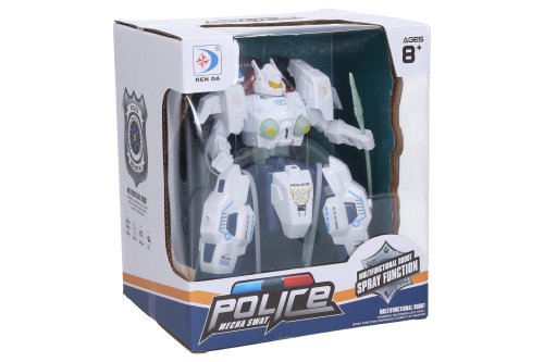 Robot policejní kouřící RC na dálkové ovládání. Rozměry 14x13,3x19 cm. Levá páčka pohyb dopředu a dozadu, pravá páčka otáčení vlevo a vpravo, prostřední tlačítko kouřové efekty. 3.7V 400MAH bateriový pack do robota, 2xAA do ovladače nejsou součástí. USB kabel součástí - 2 barevné varianty - černá, bílá.